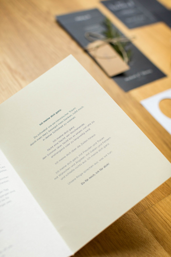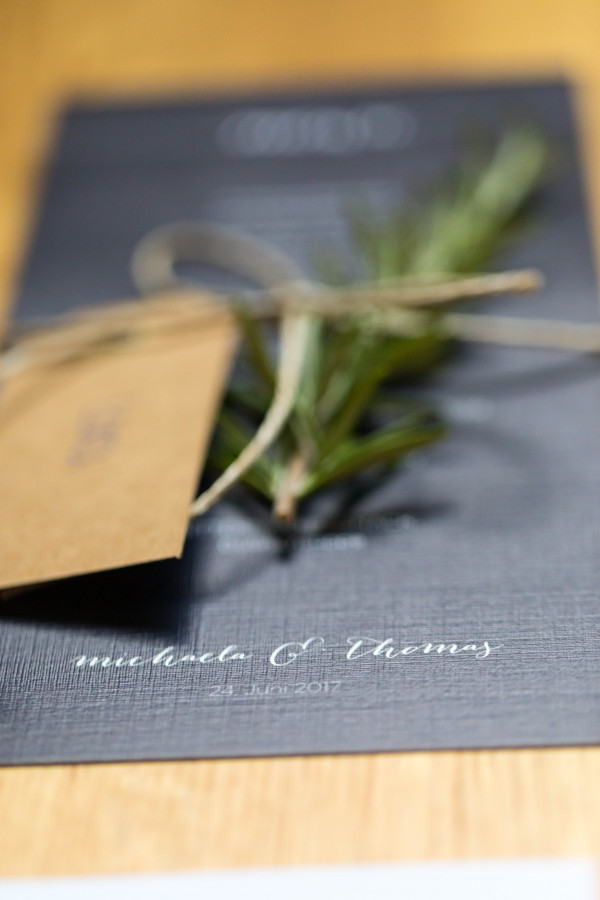 Da ich ein alter Bastelfuchs bin war die Hochzeitspapeterie ein richtiges Herzensprojekt von mir. Ich habe stundenlang auf Pinterest gestöbert und mir unendlich viele Schriften, Papierarten und DIY's angeschaut bis ich schlussendlich zu unserem Papeterie-Konzept ankam. Ich habe dann eine Powerpoint Präsentation für meinen Mann gemacht (eine Art Briefing) in dem ich jeden Punkt (Save the Date, Einladungen, Menükarten, Namensschilder, Kirchenhefte, Türanhänger fürs Hotel, Dankeskarten, etc.) im Detail beschrieben hab (Text, Schriftart, Schriftfarbe, etc.). Damit hat mein Mr. dann einen ersten Entwurf im InDesign erstellt und dank einem befreundetem Grafiker wurde alles genau so wie wir es uns vorgestellt hatten.